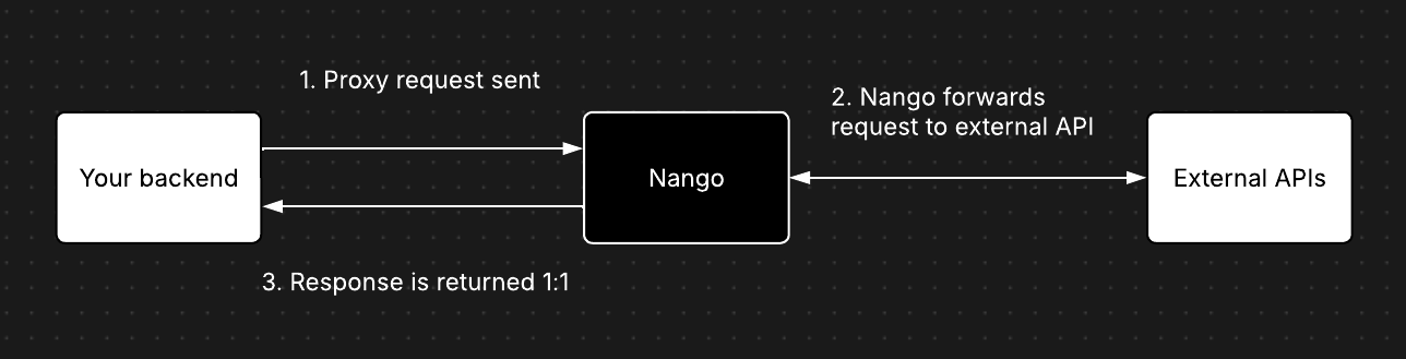 - Proxied API requests are executed 1:1 against the external API, and its response is transferred back to you without modification