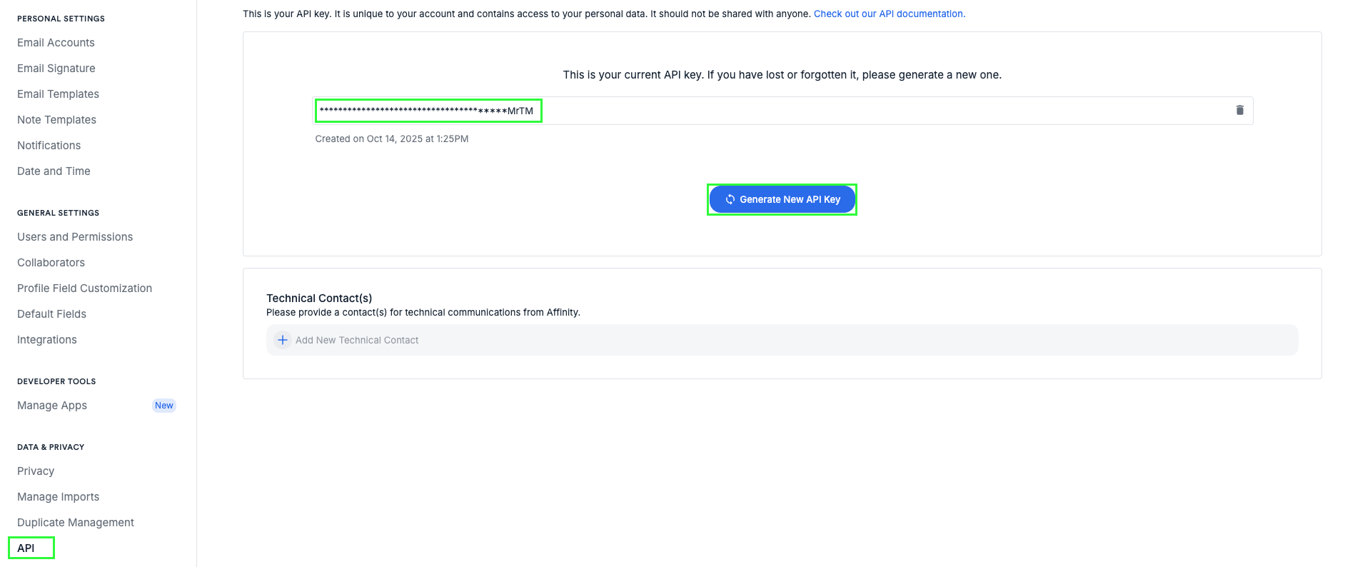 To authenticate with Affinity (v1), you will need:- API Key - A key that grants Nango permission to interact with Affinity’s v1 API resources and services.
