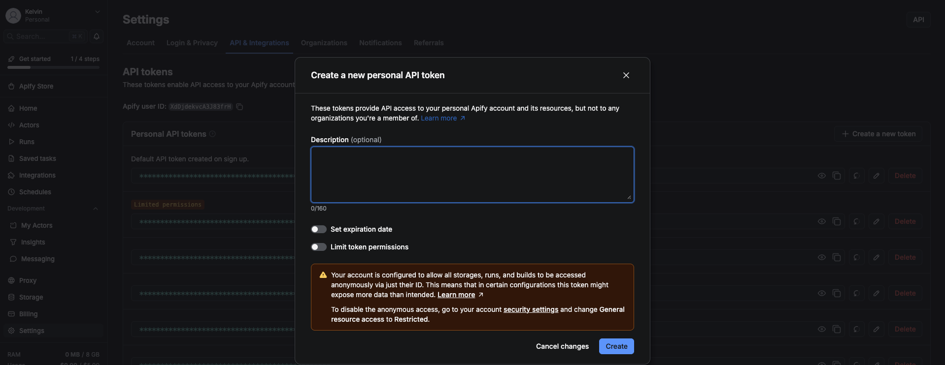- Fill in all the required information and click Create to generate your API Token.