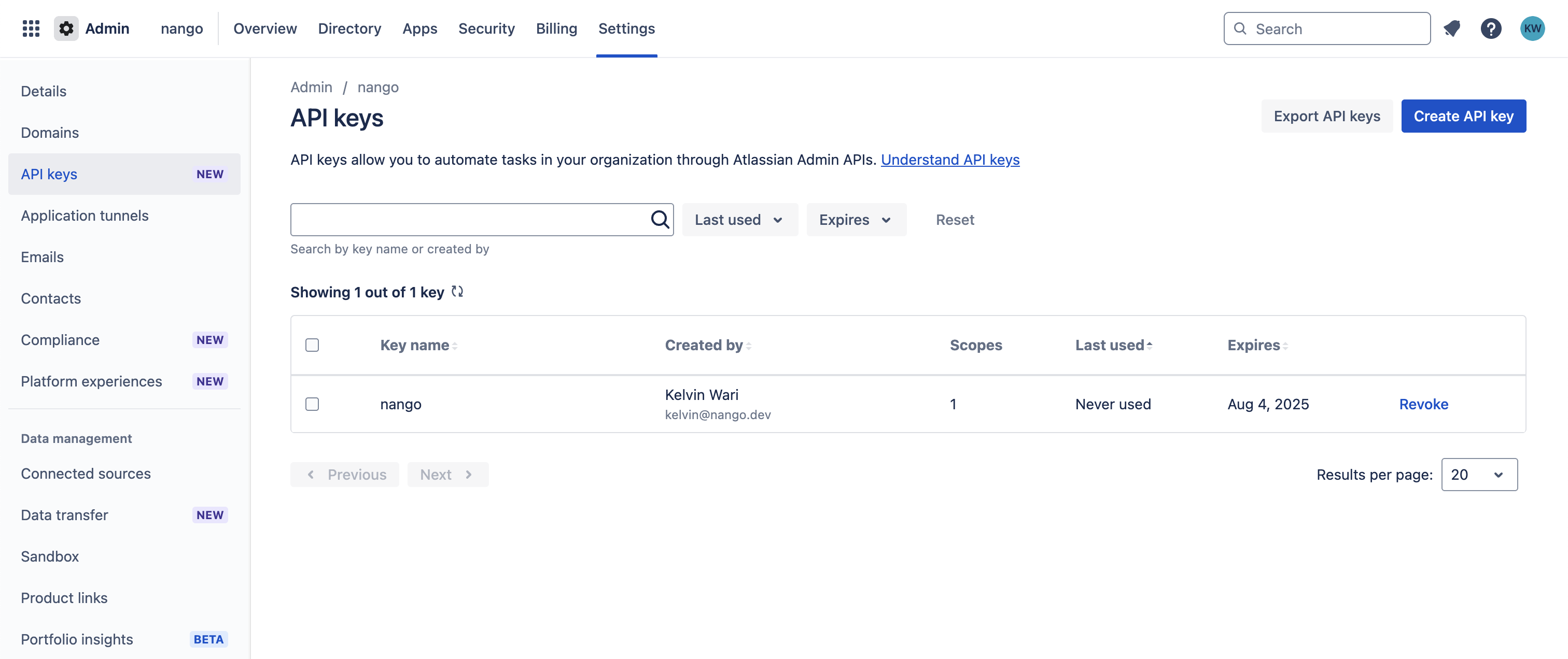To authenticate with Atlassian Cloud Admin, you will need:- API Key - A key that grants Nango permission to interact with Atlassian Cloud Admin APIs resources and services.