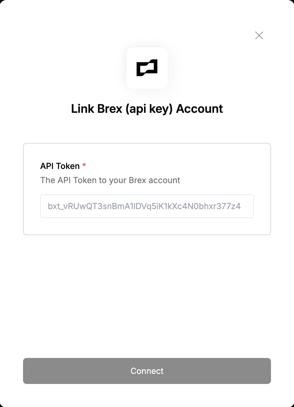 To authenticate with Brex (api key), you will need:- Api Token - A key that grants Nango permission to interact with Brex APIs resources and services.