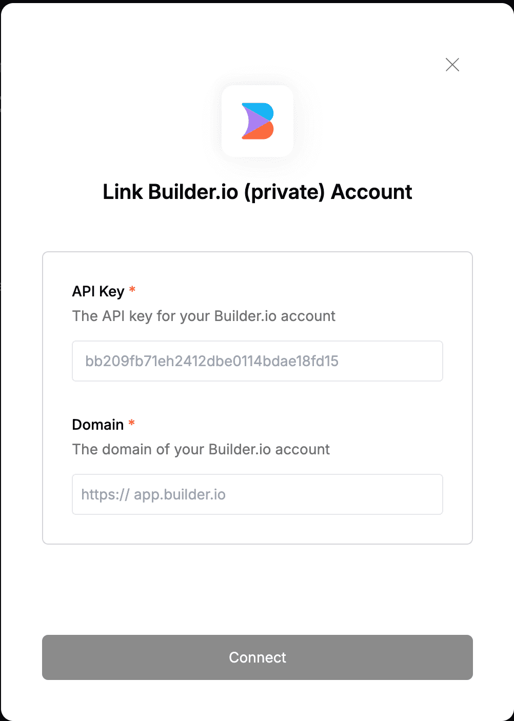 To authenticate with Builder.io (private), you will need:- API Key - A key that grants Nango permission to interact with Builder.io’s (private) APIs resources and services.