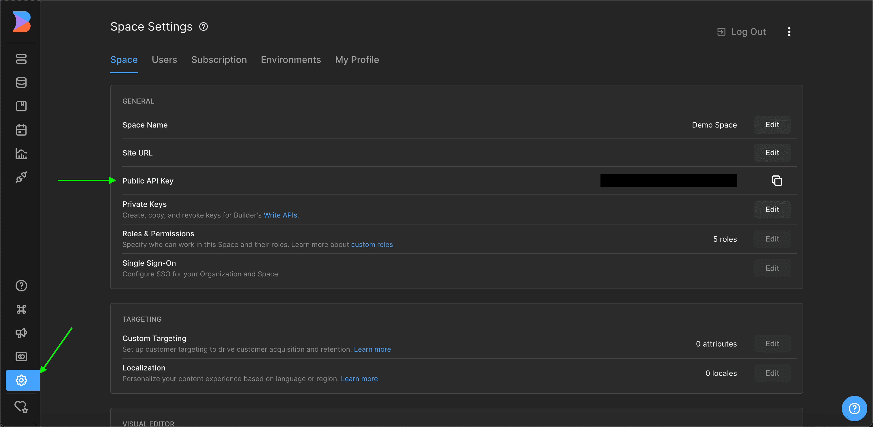 - Select your space then go to the Space settings section, under the Space tab, you can view your public api key.