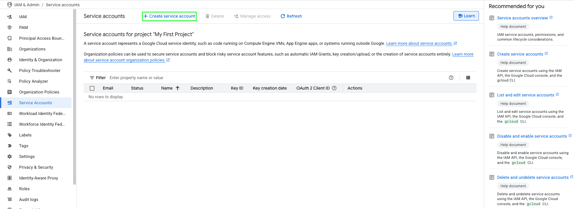To authenticate with Google Service Account, you need:- Service Account Email Address – The unique email assigned to your service account.