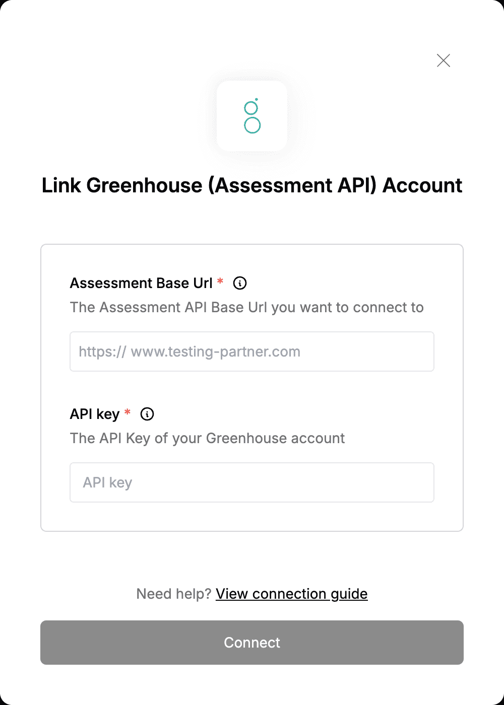 To authenticate with Greenhouse (Assessment API), you need:- API Key - Your API Key provided or managed by your integration partner.