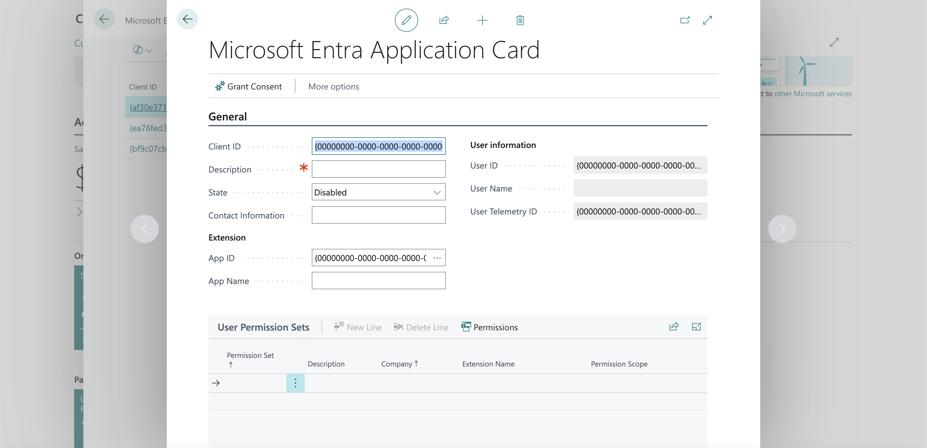 - Login to your Business Central client, search for Microsoft Entra Applications, open the page, and click New.