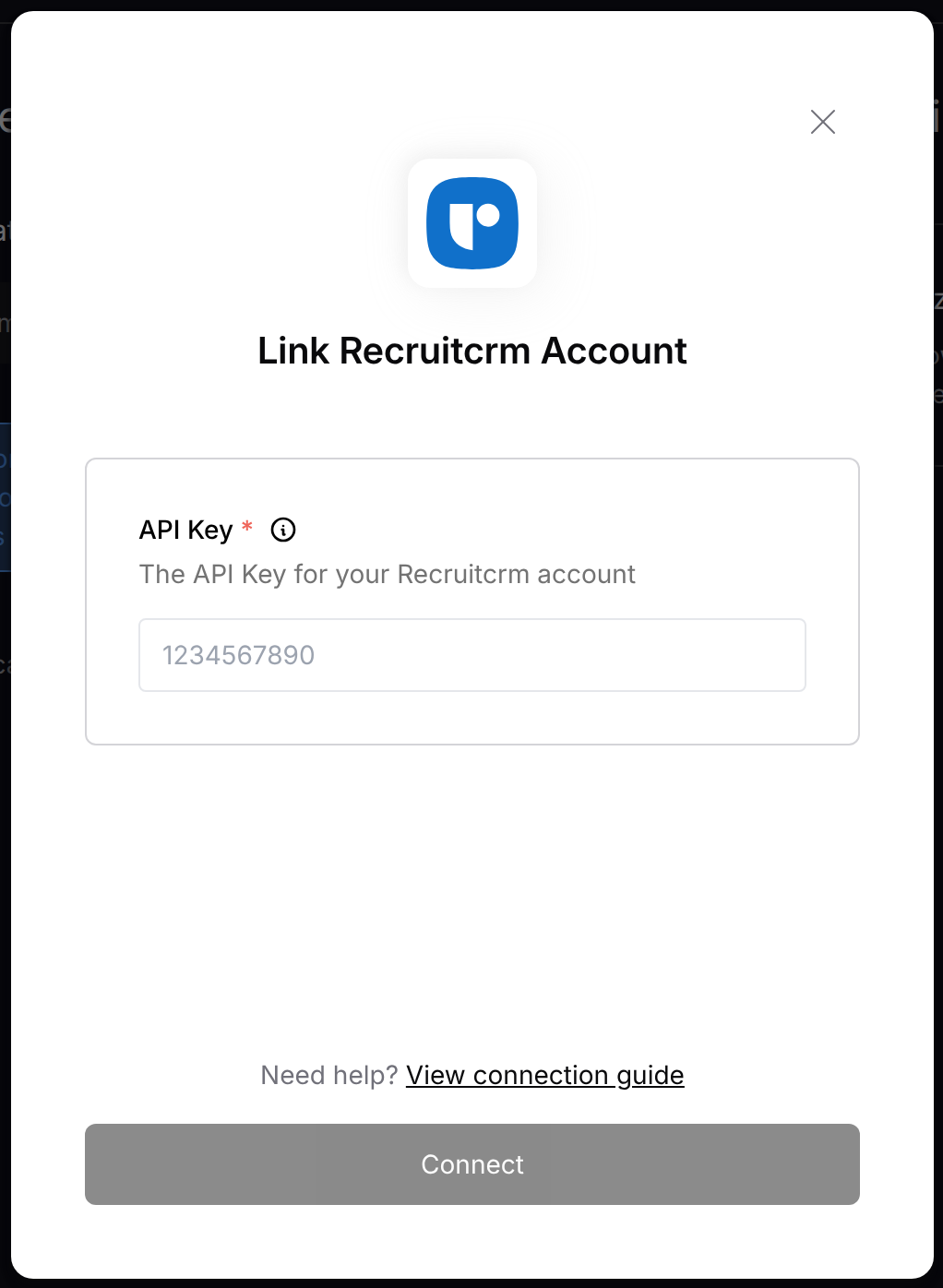 To authenticate with Recruit CRM, you need:- API Key - A key that grants secure access to the API, enabling authorized applications to interact with Recruit CRM resources and services.