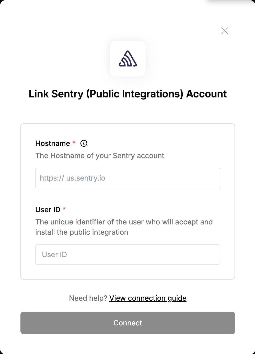 To authenticate with Sentry (Public Integrations), you will need:- Hostname - The Hostname to your SentrySentry (Public Integrations) account.