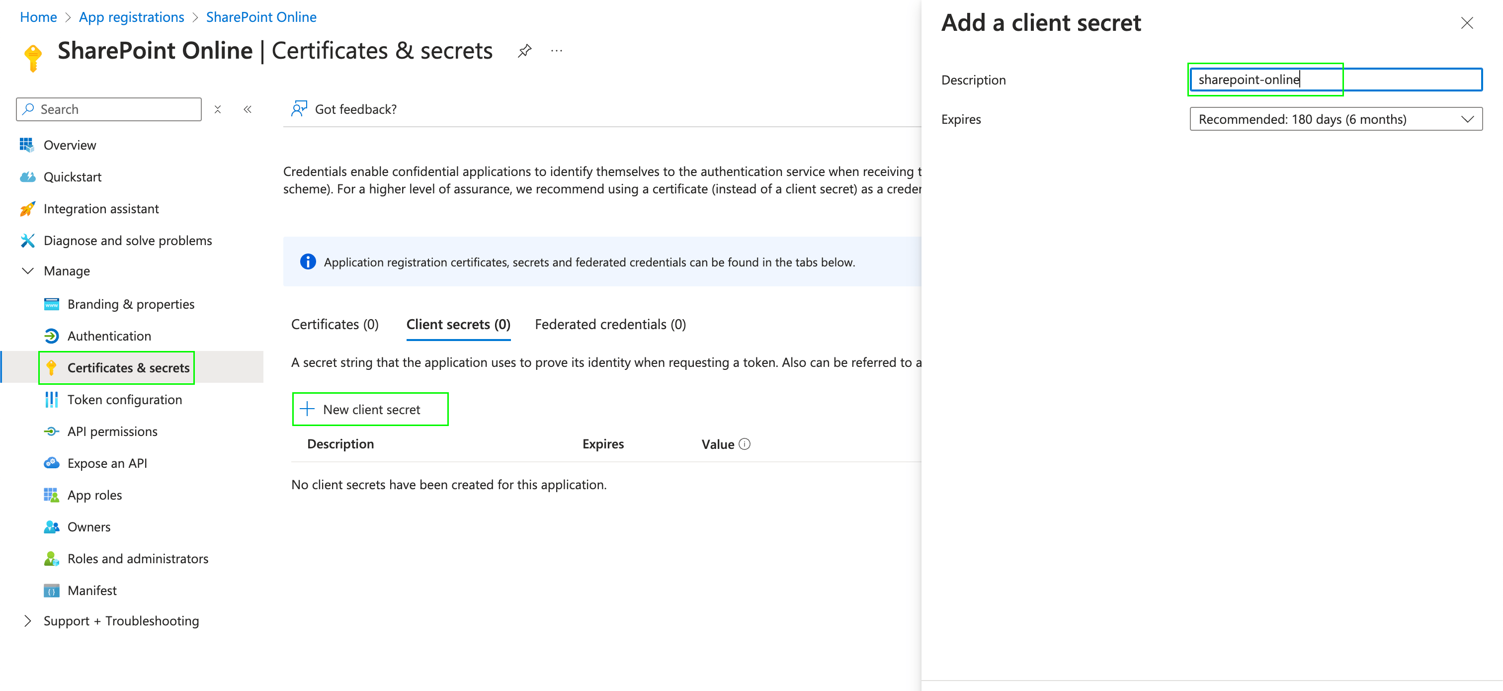 - After registering a new app in the step above, you can now generate a client secret for that specific application. Navigate to Certificates & secrets under Manage, and click New client secret.