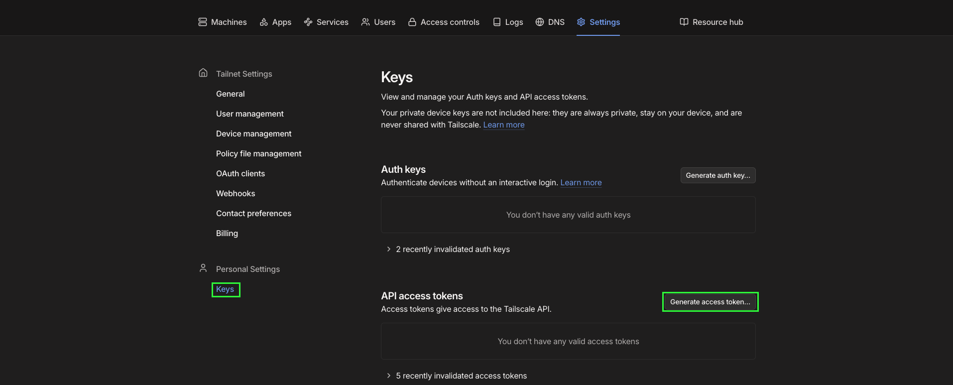 - You must have a Tailscale account with admin access to create and manage API Access Tokens.