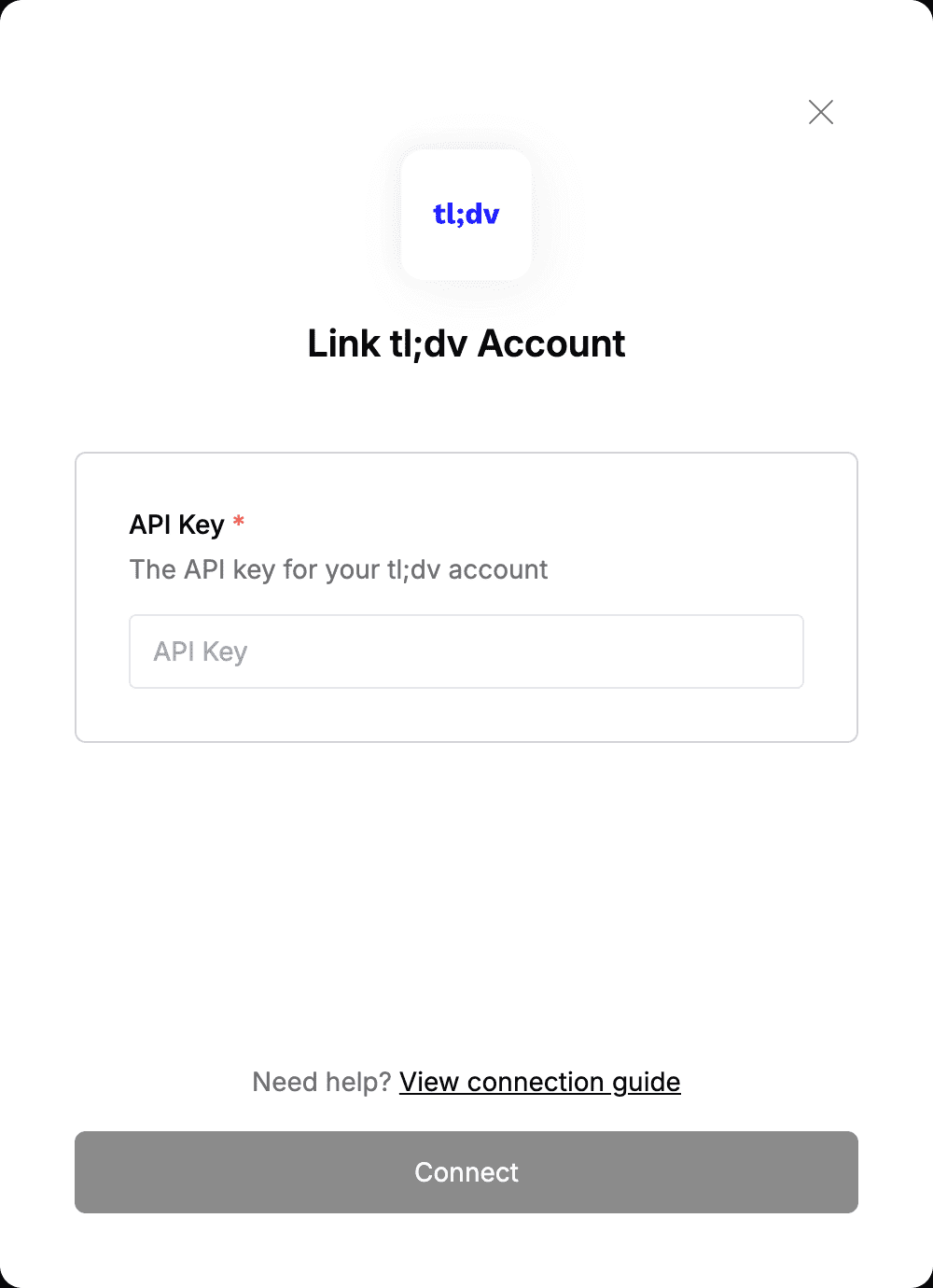 To authenticate with tl;dv, you need:- API key - A key that grants Nango permission to interact with tl;dv’s APIs resources and services.